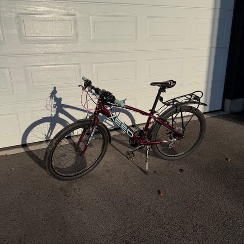 En veldig fin og god sykkel med 24 gir (Shimano) som passer til alderen 8-12 år, utstyrt med bagasjebrett, flaskeholder, ringeklokke, refleks og lys foran (som riktignok henger i en «tynn tråd» - festet til lykten er ganske ødelagt, se siste bilde), lys og refleks bak og skjermer både foran og bak. Oppbevart inne i sportsbod.