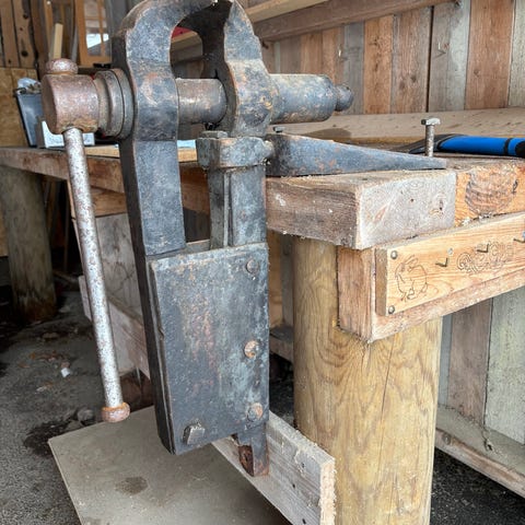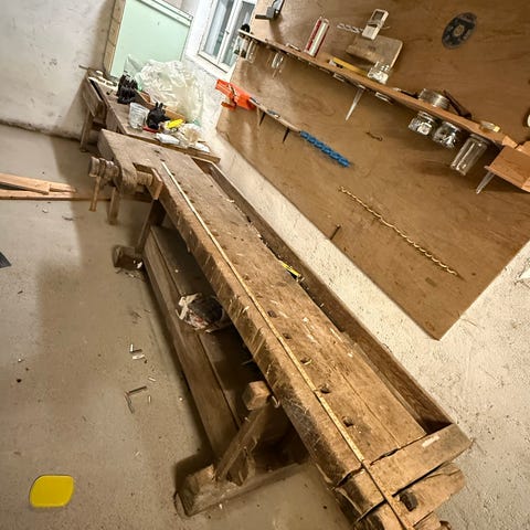 Hamran arbeidsbenk i tre med innebygget tvinge i enden. Benken har hull for benkehaker langs kantene og en lang, åpen verktøyrenne i midten for oppbevaring av håndverktøy og smådeler. Egnet som arbeidsbenk i snekkerverksted, garasje eller hobbyrom der det er behov for en solid trebenk til trearbeid og annet håndverk. Mangler benkehaker