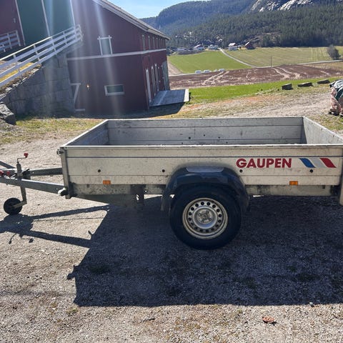 Gaupen tilhenger med kapell i grå farge. Tilhengeren har stålkasse med nedfellbare lemmer og grått presenningstak festet med strikk. Utstyrt med lys, reflekser og registreringsskiltfeste bak, samt drag med nesehjul foran. Egnet for transport av bagasje, hageavfall og annet gods innenfor tilhengerens vekt- og størrelsesbegrensninger. Kasse er 195x145