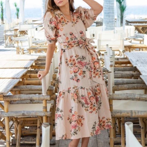 Kjolen er flerfarget med småmønstret trykk og laget i viskose. Modellen har kort erm, v-utringning og markert midje med lett rynking. Skjørtet er langt med volangkant nederst.
