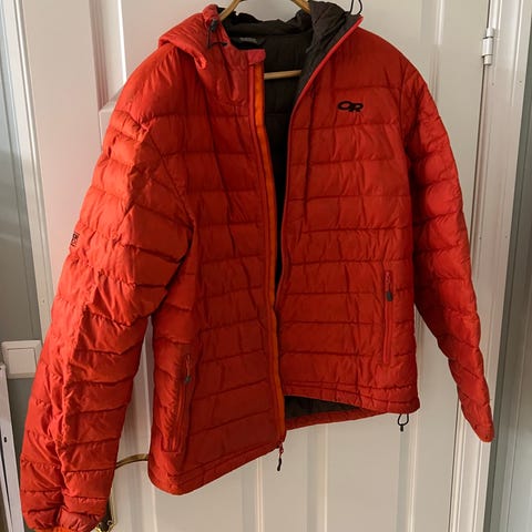 Parajumpers Anchorage dunjakke for herre i størrelse M. Jakken er oransje og fylt med dun, med vattert, horisontalt quiltet mønster. Den har høy krage, glidelås i front og brystlomme med glidelås. Klassisk Parajumpers-merke er plassert på ermet. Egnet som lett og isolerende ytterjakke i kjølige temperaturer.