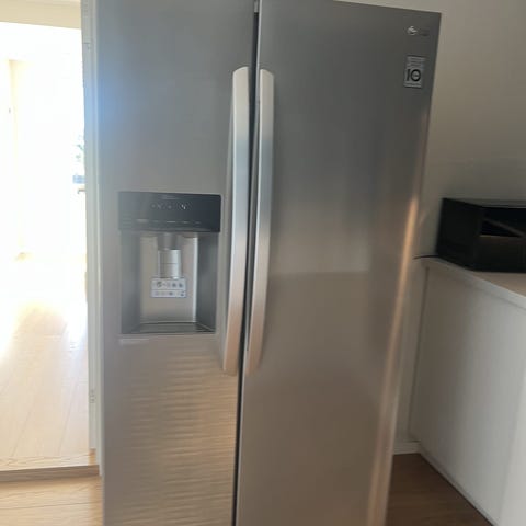 2,5 år gammelt LG Side-by-Side kjøleskap i rustfritt stål. Modellen har 3 dører (inkl 1 door in door) og integrert isdispenser i døren (ingen vanntilkobling- det er vanntank).