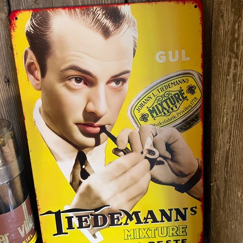 Tiedemanns Rød emaljeskilt i rød farge. Skiltet har teksten «Tiedemanns Rød – ikke for nybegynnere» og motiv av Tiedemanns Rød Mixture 2 tobakkspakke. Egner seg som veggdekor, for eksempel i garasje, kjellerstue eller samling av gamle reklameskilt.
