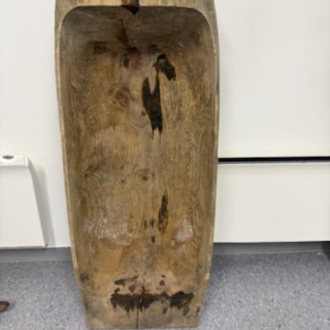 Rektangulær tretrau i heltre med utskåret, ovalt trau i naturfarget treverk og grønnmalt kant/ytterdel. Passer som dekorasjon, til oppbevaring eller som rustikt innslag i interiør. Overflaten har synlige bruksspor som gir et slitt og tradisjonelt preg.