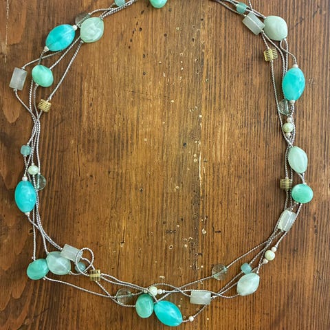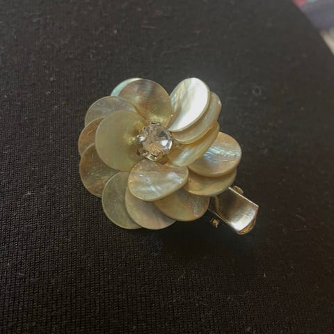 Vakkert halssmykke av perlemor og skinn selges. Nydelig glans av perlemor. Se bilder. Godt brukt. Kanskje du vil vaske skinn - reimen? Jeg har vært veldig glad i dette smykket. Svært anvendelig. Dekorativt. Har vært med på flere reiser. Fint brukt også.