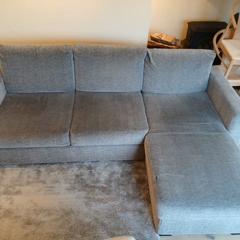 Pent brukt sofa med sjeselong selges. Passer til f.eks hybel eller Tv-stue. Ai fyller automatisk inn Ikea, men vi er usikre på merke/forhandler. Lyst grått stoff. Lengde 210cm Dybde på sjeselong del 145cm