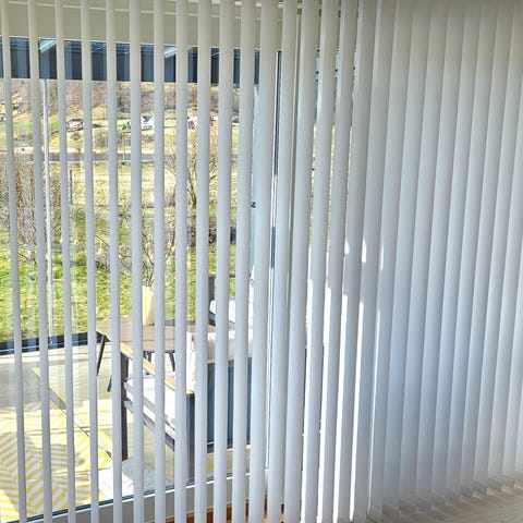 Høykvalitets lamellgardin i hvit hard plast som henger stødig i innvendig karm eller utenpå alt etter hva man ønsker. Sitter nå i innvendig karm med bredde 135 og høyde 225.