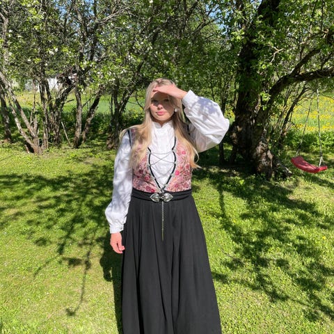Ubrukt Berit festdrakt med nydelig brokadevest. Med fine broderte blomsterbånd på vest og stakk, og fine sølvfargede bånd på beltet, stakk og vesten. Brokadevest med diskret mønster i sort. Størrelse på livet og beltet kan justeres da det er festet flere hemper til lukning. Der er ekstra sømrom til justering av størrelsen i vest på ca 3 cm i hver side og stakk ca. 9 cm. Festdrakten går i doble str. og er dermed romslig i passformen