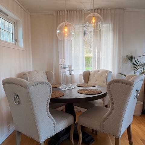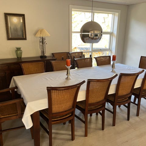 Spisegruppe i heltre selges. Følger med 8 spisestoler og ileggsplate. Bordet kan demonteres.