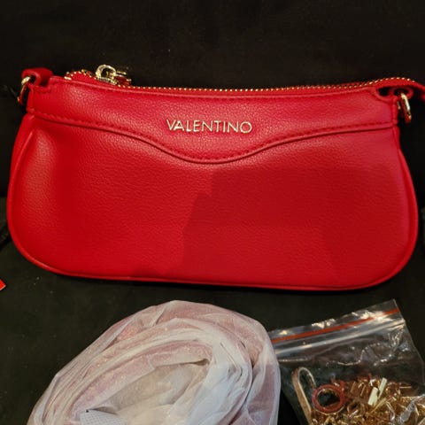 Valentino veske for dame i rødt kunstlær. Vesken har doble håndtak og et preget/logomønster på fronten. Der følger med dustbag og lang rem!