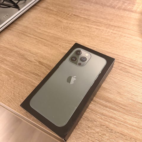 Selger en fint brukt Apple iPhone 13 Pro smarttelefon med 128 GB lagringsplass. Modellen har trippelt kamera på baksiden og frontskjerm som dekker nesten hele forsiden. Fargen fremstår som mørk/svart.