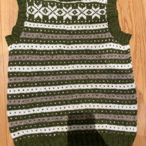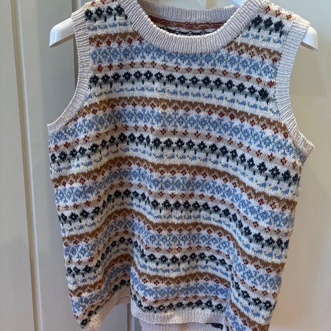 Skall Studio ullvest for dame i størrelse M. Vest i merinoull med flerfarget mønsterstrikk. Ermeløs modell med rund hals og ribbestrikkede kanter. Egnet som lag-plagg over skjorte, genser eller kjole i hverdagen eller på jobb.