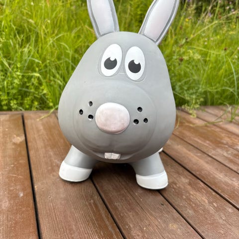 Gerardo hoppende kanin til salgs. Denne kan brukes både utendørs og innendørs. Kun brukt innendørs her, så i god stand. Den har gått gjennom en runde med tusjen, har prøvd å vaske bort, har fått bort det verste.