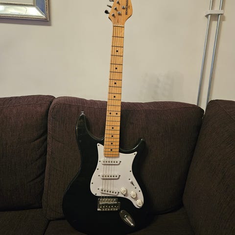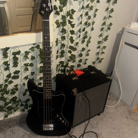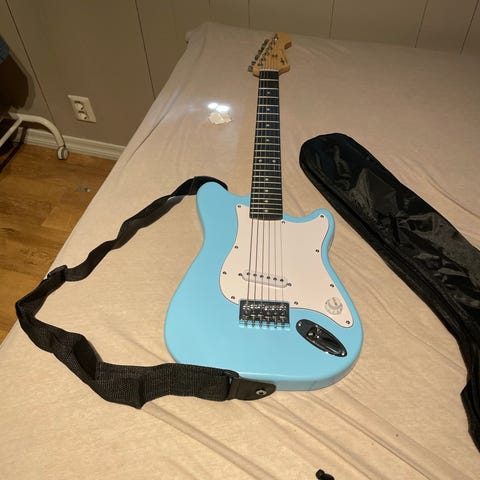 Selger venstrehendt el-gitar med alt utstyr. Kjøpt den ny til jul. Passer perfekt for barn fra ca 8 år.