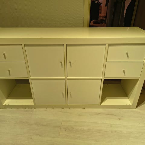 Fin, hvit Kallax-hylle fra IKEA. Praktisk og pen. Kan brukes både liggende og stående. Enten som hylle, skjenk eller romdeler. 2 skuffeseksjoner er montert. Kan også demonteres. 3 fine kurver som passer perfekt kan følge med på kjøpet.