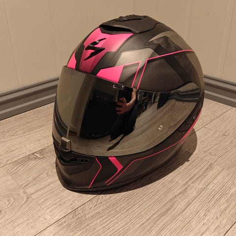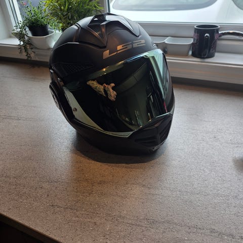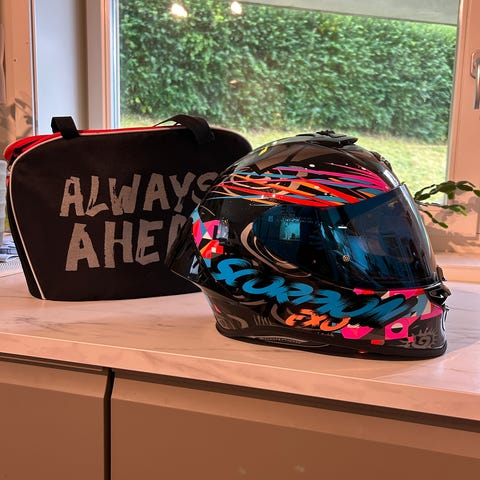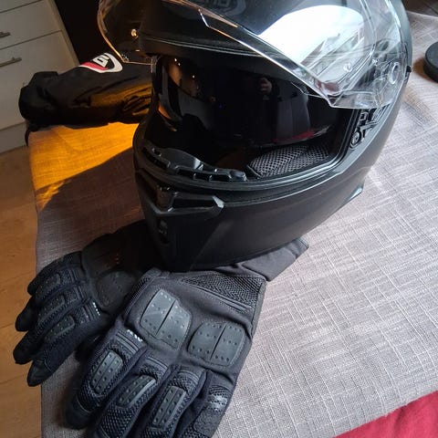 Scorpion Exo MC-hjelm i helmodell med klart visir og mørkt solvisir. Hjelmen leveres med original Scorpion Exo hjelmpose. I tillegg følger et par svarte MC-hansker med forsterkede knoker og polstring, samt en svart MC-bukse med glidelåslommer og refleksdetaljer nederst på bena. Utstyret er egnet til motorsykkelkjøring og gir grunnleggende beskyttelse for hode, hender og ben.
