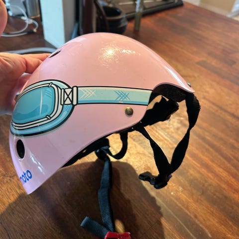 Selger en tøff Electra sykkelhjelm i rosa farge med dekorative motiver av en kul katt som solbriller. Hjelmen er designet for syklister og skater-brukere, og passer hodestørrelser mellom 55 cm og 58 cm. Den har flere ventilasjonsåpninger for lufting og justerbar rem for sikker passform. Har ikke blitt utsatt for skader eller fall.