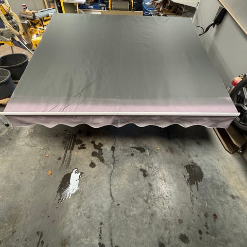 Markise med svart ramme utvendig montering i antrasitt farge. Mål: 3,95 cm bredde og 300 cm utstrekning. Den har misfarging så fargen har gått fra svart til antrasitt grå farge. Man kan få tak i nytt markisetrekk på nett. Noe små rust på stålet ved tallfestet. Følger med 3 veggfester og den er demontert. Brukt i 4 år. Pris ny er over 6000,-.
