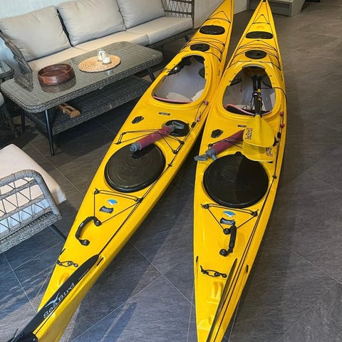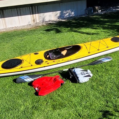 Kjempefin og god kajakk brukt i underkant av 10 turer av meg og min sønn. Stabil og god både å sitte i og padle. Det er 2 lasteluker og en fagskole med neopren-lomme. Senkekjøl med ror gjør det lettere å manøvrere kajakken. Den glir lett i vannet og har stramme og fine strikker på dekk. Lett og fin i vekt gjør det lett å bære og tømme i vannet dersom du bikker eller øver på redning. Åre og annet utstyr følger ikke med
