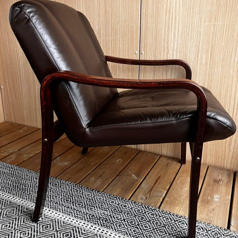 En spesiell stol der jeg ikke kan dokumenter produset eller arkitekt. Men det er en spesiell stol i rotting. Jeg har bare sitteputen som har 4 trykknappfester. Stolen er solid og uten skader. Gi gjerne bud på denne