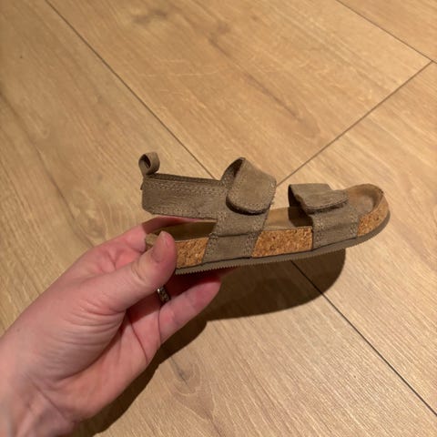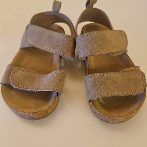 Sandaler til barn. Sandalene har to justerbare borrelåsstropper over foten. Eier vokste fort ut av skoene, dessverre.