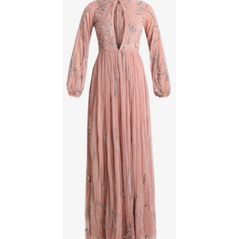 MISSMAYA festkjole for dame i størrelse M. Kjolen er grønn og laget i polyester. Modellen har omslagstopp med V-utringning og lange ermer. Skjørtet er langt med lett utsvinget fasong. Egnet til bruk ved festlige anledninger og andre formelle eller semi-formelle sammenhenger.