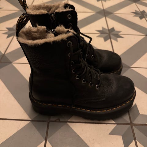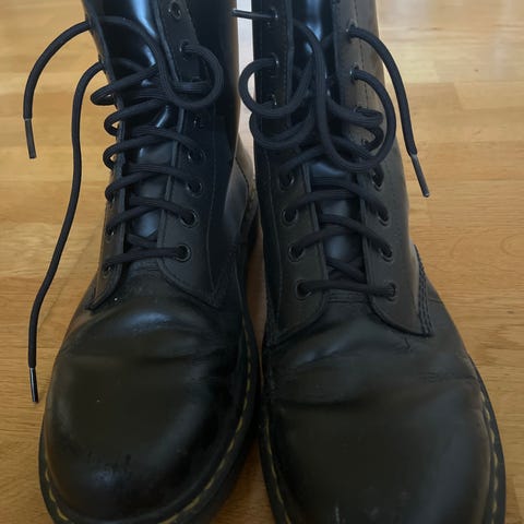 Dr. Martens støvler i størrelse 38. Klassiske snørestøvler i svart skinn med karakteristiske gule sømmer og hemper bak. Overdel i glatt skinn og kraftig såle i gummi. Passer til hverdagsbruk og fritid i ulike værforhold.