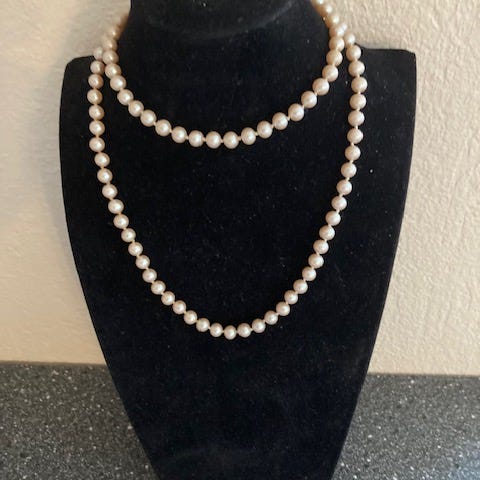 Perlekjede med hvite, runde perler jevnt rundt hele kjedet med knute mellom hver perle. Fin glans. Melkehvit/ bomullshvit farge..Kjedet er langt og kan bæres hengende ned. Total lengde ca 79,5 cm. Henger ned ca 39,5 cm. Perlens diameter ca 8 mm. Det har en dekorativ, sølv lås med gravert mønster. Baksiden på låsen viser 925 stempel. Som smykke til dame og kan brukes både til hverdags og mer formelle anledninger. Kjøpt hos gullsmed i Hgsd. Smykket er fint oppbevart. Perlene er fine og låsen er god og i orden., blir ikke solgt under oppgitt pris.,