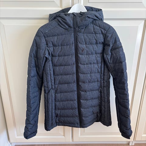 H&M jakke for dame i størrelse M. Jakken er svart og laget i polyester. Den har hette, glidelås i front og vatterte felt foran og bak, med elastiske stoffpaneler i sidene og på ermene for bedre passform og bevegelighet. Passer som lett ytterjakke eller mellomlag i hverdagen og til fritidsbruk.