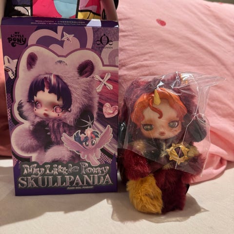 Nyeste utgivelse fra Skullpanda, My Little Pony samarbeid. Har 1 av hver utgave utenom secret. Produktet kommer i en illustrert pose med Skullpanda- og My Little Pony-motiv. Inneholder en myk figur (plush) inspirert av Skullpanda-serien i samarbeid med My Little Pony. Egnet som samleobjekt eller dekorasjon for fans av serien.