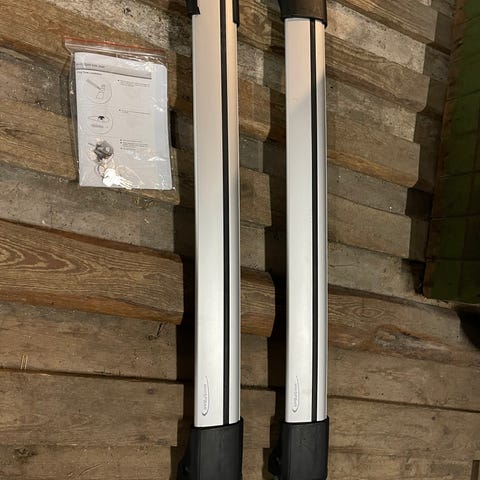 Originalt Volvo takstativ i aluminium i sølvfarge med sorte endestykker. Originale lastebøyler fra Volvo, merket med blant annet delenummer 32270146. Har stått på en Volvo V60 2012 model.