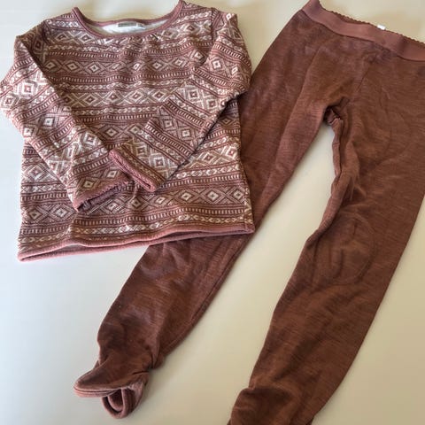 Matchende genser, str 134/140. Denne er merinoull, med bomull på innsiden. Begge deler er ubrukt med lepper. Nypris er 800. Selges for 400.
