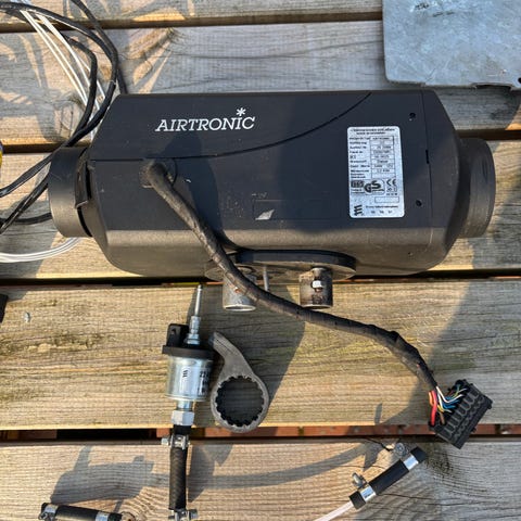 Varmeapparatet har metallkasse med flere runde tilkoblingspunkter for luftslanger/kanaler i plast på den ene siden, og større runde åpninger på motsatt side. Det følger med tilkoblingskabler og kontakt som vist på bildene. Apparatet er beregnet for 12V-anlegg og kan brukes i kjøretøy, maskiner eller andre installasjoner der det er behov for et kompakt varmeapparat med kanaltilkobling.