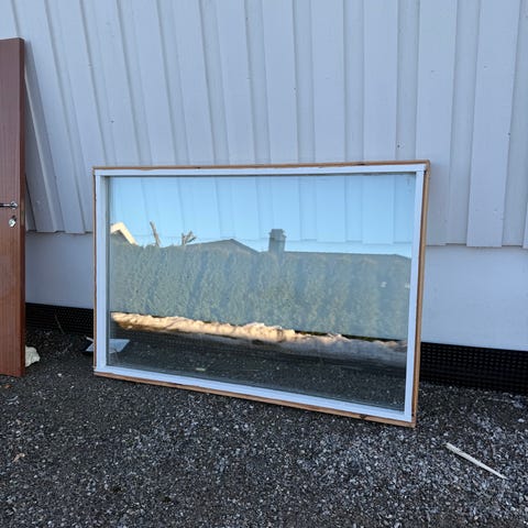 Pil og bue gamle vinduer med sprosser i tre, malt hvitt. Vinduet har flere knuste ruter og synlig slitasje i maling og ramme. Egner seg til gjenbruk, restaurering eller som dekorasjon i interiør og hageprosjekter.