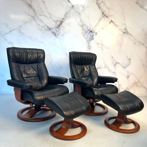 Selger to komfortable lenestoler i sort skinn med tilhørende krakk. Stolene har god sittekomfort med høy rygg og myke puter. Passer fint i stue, tv-krok eller lesekrok.