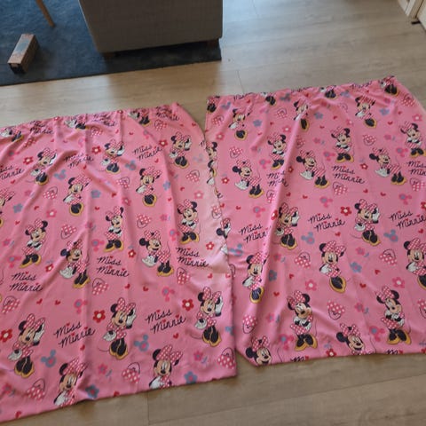 Søte rosa, lystette gardiner med et mønster av Minnie Mus og mælkebøtte-frø. 2 lengder. 160 cm.