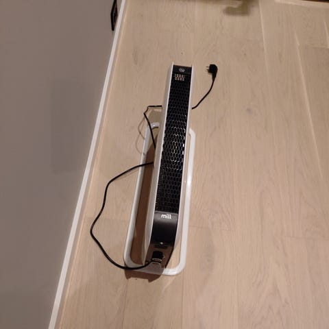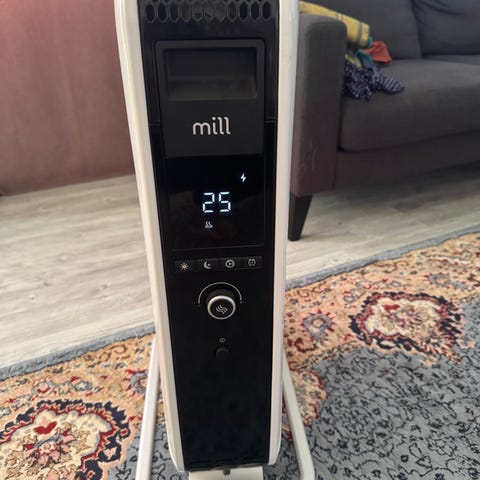 Mill panelovn i hvit utførelse. Ovnen står på en ramme/fot som gjør at den kan plasseres fritt på gulvet. Den har digitalt display og betjeningspanel på siden. Egnet som ekstraoppvarming i rom der det er behov for en kompakt elektrisk ovn. Strømkabel tilkobles på siden av ovnen.