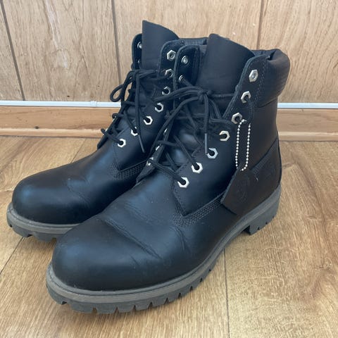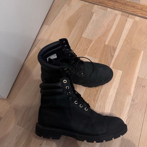 Timberland boots i størrelse 44. Modellen er en ankelhøy snørestøvel i svart farge med kraftig yttersåle og polstret ankelparti. Overdelen er i et nubuck-/skinnlignende materiale med Timberland-logo preget på hælen. Passer som hverdags- eller fritidssko i kjøligere vær. Skoene er svært lite brukt. De er i str eu 44,5.