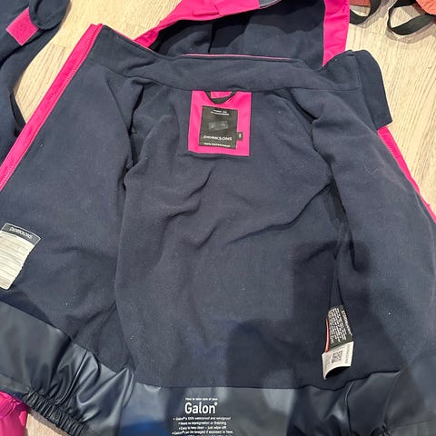 Helly Hansen regnsett for barn i størrelse 110 for jente. Foret sett med regnjakke og regnbukse i rosa polyester. Jakken har hette, glidelås foran og elastikk ved ermeåpninger. Buksen har justerbare seler, elastikk nederst på bena og fotstrikker. En fotstrikk mangler.