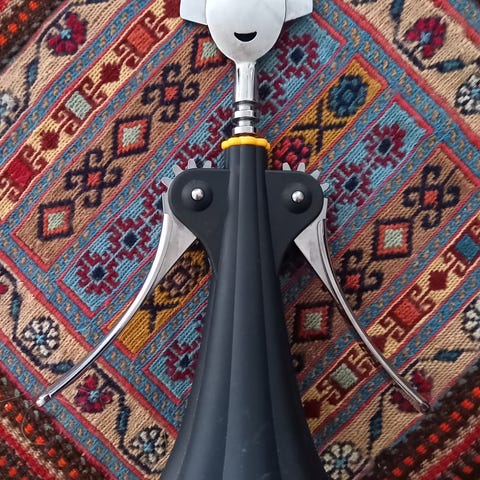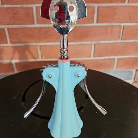 Alessi vinåpner i figurdesign. Manuell korketrekker med armer som løftes for å trekke ut korken. Farge hovedsakelig svart med metalliske detaljer og kontrastfarget ring ved halsen. Egnet til åpning av vinflasker på kjøkken eller bar.