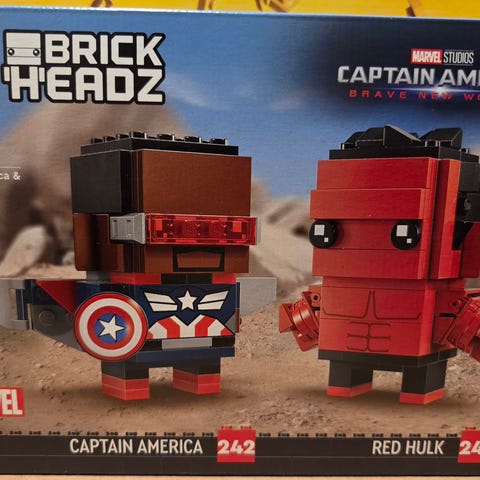 Nytt, uåpnet Lego 40668 Kaptein Amerika og Rød Hulk Brickheadz selges. Utgått produkt. Selges til veiledende utsalgspris.