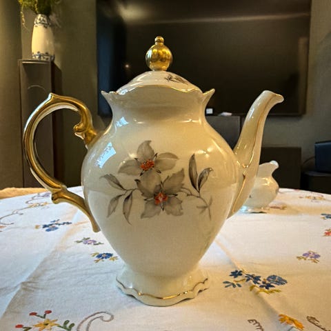 Kannen har en klassisk, slank form med rike gulldetaljer og et sjarmerende blomstermotiv i blått, hvitt og grønt. Dette spesifikke motivet er uvanlig å se på bruktmarkedet, noe som gjør den til et flott funn for samlere eller deg som ønsker noe helt unikt til dekkingen.