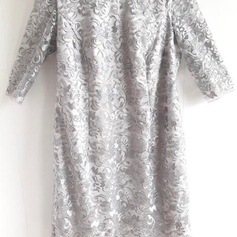 Lekker innsvinget kjole fra Latika i str.36.Ny med tag. Lekre stener rundt halsen. Glidelås i ryggen. Foret. Tykt brokadelignende stoff. Størrelse S. 97% bomull. Lengde fra overkant skulder til skjørtekant ca 90 cm. Omkrets under armer ca 80 cm, liv ca.68cm.