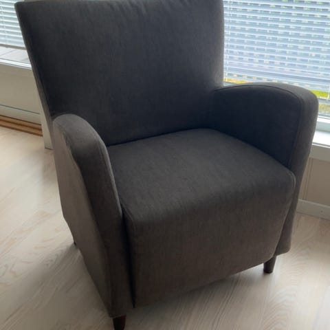 Vi selger denne lenestol med mørke grå tekstil