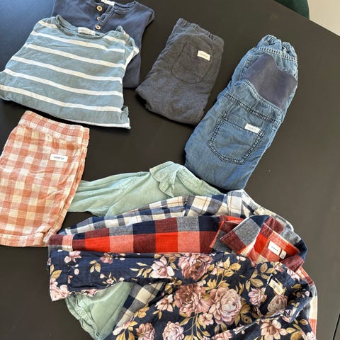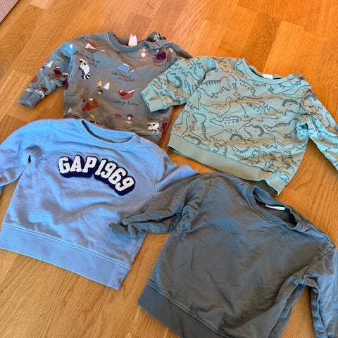 Gensere i størrelse 86 og 86/92. Flerfargede overdeler med ulike motiver og nøytrale nyanser.