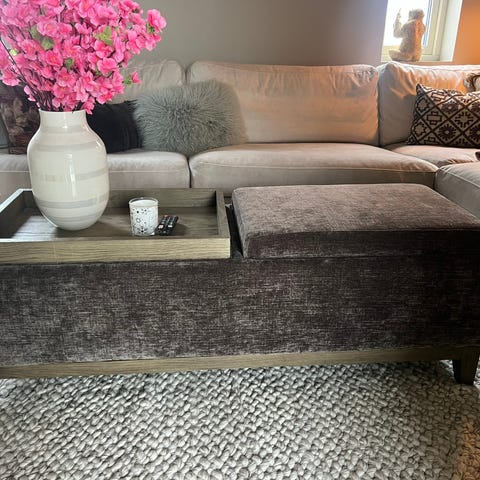 Puff med grå/grønn tekstilpolstret topp og mørk trebase 86x86 cm. Toppdelen har enkel knappestikking. Under setet er det to uttrekkbare brett, som kan legges oppå puffen for å gi en plan bordflate. Møbelet kan brukes både som fotskammel, ekstra sitteplass og som lavt sofabord. Ny pris 3500,-