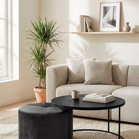 Puff sofabord med oppbevaringsskuff grå tekstil og mørkt tre