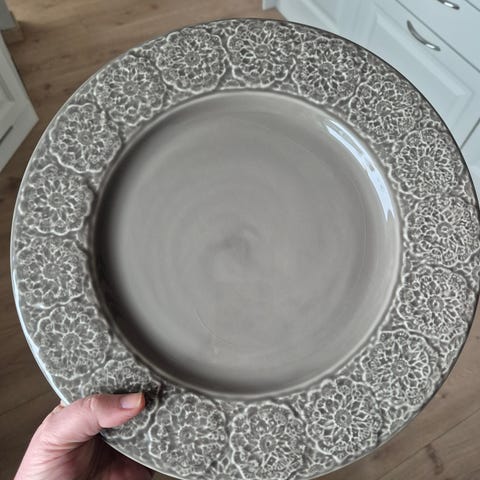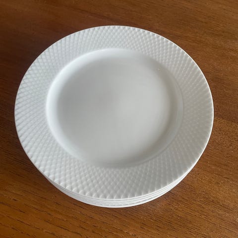 12 middagstallerkener og 8 asjetter med mønster langs kanten, hvite. Må hentes på Øvre Toppenhaug :)