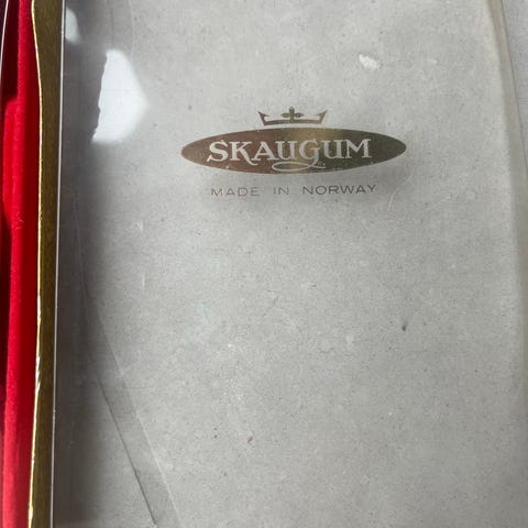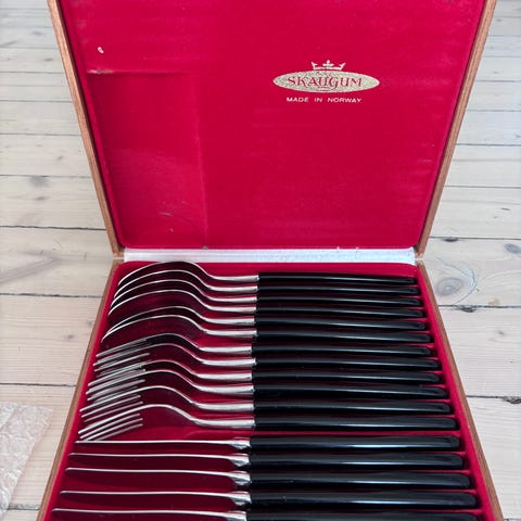 Skaugum bestikksett. Settet leveres i original eske med tilpasset innredning for bestikkdelene. Bestikket har et enkelt og tidløst design i metall/stål, egnet til bruk ved måltider i hjemmet eller ved selskaper. 18 Deler. Pris kan diskuteres ved rask handel.