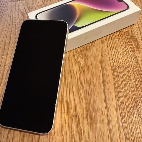 Sort Apple iPhone 14 med 256 GB lagringsplass. Pent brukt, alltid med deksel og skjermbeskytter. Skjerm og telefon for øvrig er ripefri. Enkelte små, hvite prikker på sidene som er lite synlige (se bilder).